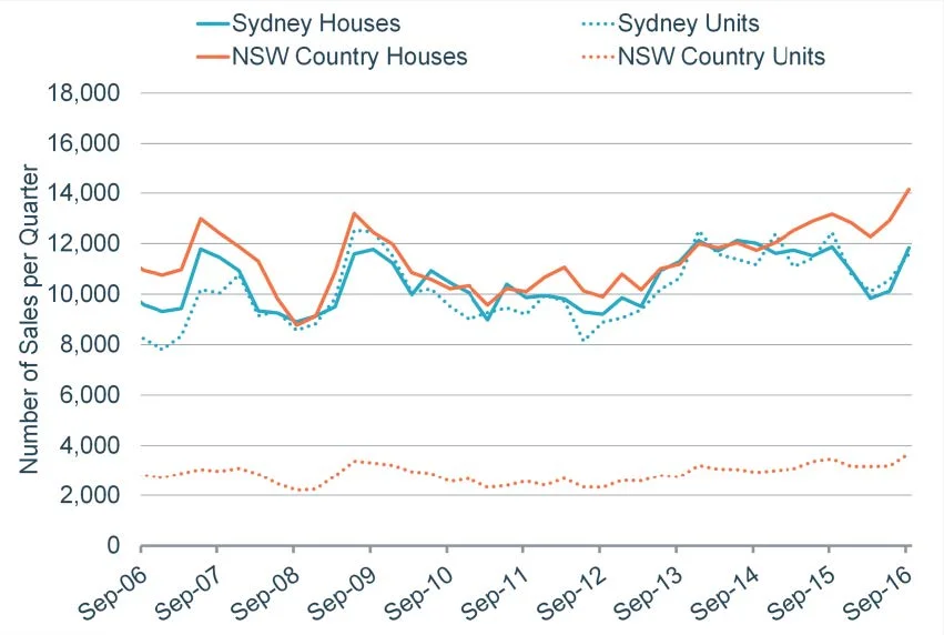 Low interest rates have slowed the decline in dwelling growth, allowing more time for the economy to adjust. Sales experienced an uptick in the September quarter. The graph at left shows the seasonally adjusted Residex quarterly sales figures for Sydney houses and units, as well as Country NSW houses and units.