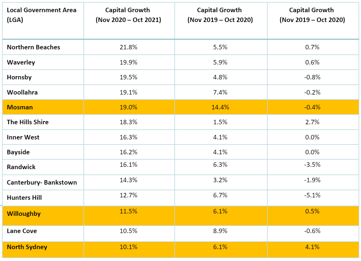 Table 1 shows fourteen LGAs in order of their house price capital growth over the last three years. As you can see, the figures across board have drastically risen in the past year. In Sydney’s lower north shore, Mosman takes the lead, with Willoughby and North Sydney showing relatively modest growth.