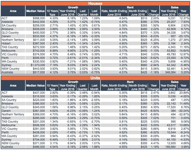 The Sydney , Melbourne and Brisbane markets experienced strong gains with the exception of home units in Brisbane, where the market is flat. WA and NT continue to decline.